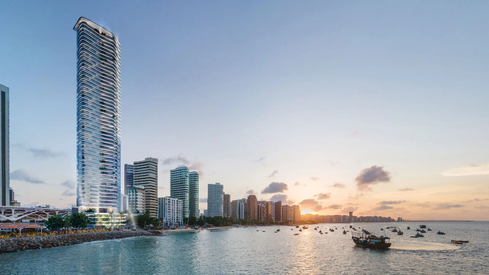 Soon to be one of the tallest towers in Northeastern Brazil, Diagonal by Pininfarina celebrates Diagonal’s 40th anniversary in real estate with the highest standards of excellence in design and spatial strategy, bringing together a market-leading mix of elegance, boldness, and efficiency. Embracing the picturesque ocean landscape, the new luxury residence will feature a curved façade, reminiscent of waves crashing on the shore below. Its organic shape, inspired by the smooth lines and proportions of high-end nautical design principles, appears to ripple in the wind. The strategic use of a living green façade – which tapers upward from the lush base of the tower – will offer a rainforest-like oasis at the heart of Fortaleza’s urban fabric and serve as a key driver for the city’s continued urban afforestation and regeneration efforts. Fonte: Pininfarina